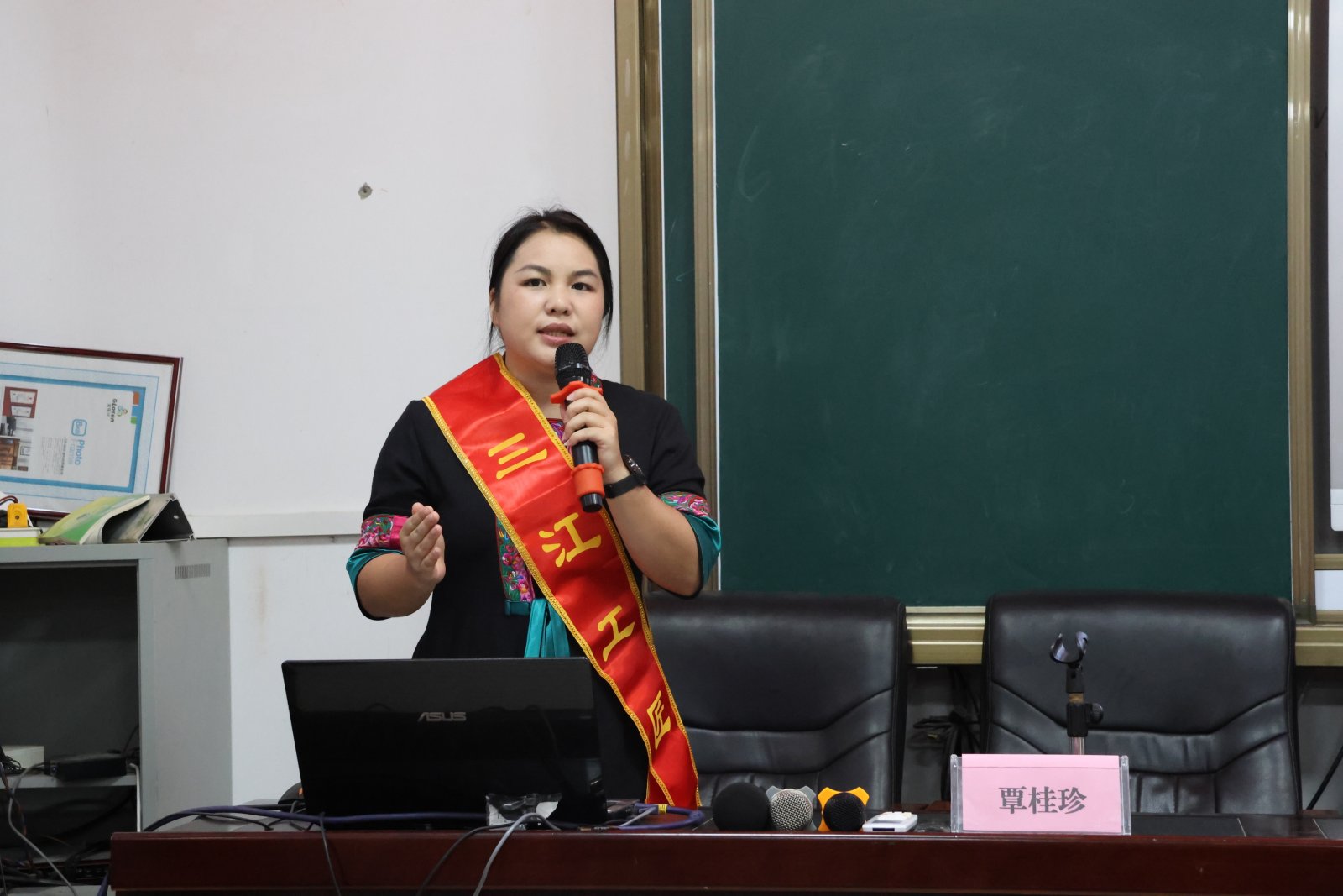 活动中,覃桂珍老师以传承侗族服饰制作技艺为主题,以侗语娓娓道来自己与刺绣的不解之缘。她提到,自幼受母亲熏陶爱上刺绣手艺,大学毕业后毅然接过侗族刺绣家族第5代传承人的接力棒,在县城创办工作室与微车间。为了用新理念突破传统设计瓶颈,她曾为打磨一件精品绣品连续熬夜 40 天;更牵头以“企业+基地+传承人+ 绣娘”模式组建绣坊,带领留守妇女实现家门口就业增收。“把每根丝线穿好、每个针脚绣齐,就是工匠精神?!闭饩渲势拥幕坝铮煤⒆用窃隈鎏姓媲卸炼恕敖承摹钡哪诤?。
